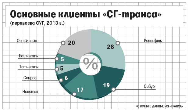 «Башнефть» - крупнейший клиент «СГ-транса», а «СГ-транс» - крупнейший железнодорожный оператор для нефтяной компании, говорит источник, близкий к одной из компаний. Объем перевозок, который приходится на «Башнефть», «СГ-транс» не раскрывает. По оценке собеседника «Ведомостей», на «СГ-транс» приходится 60% грузов «Башнефти». В сегменте перевозок сжиженных углеводородных газов (СУГ), по данным на 2013 г., крупнейший клиент компании - «Роснефть», следует из материалов оператора (см. врез). Средний срок контрактов оператора - восемь лет, говорится в его материалах. Объем грузовых перевозок группы «СГ-транс» в 2013 г. - 18,8 млн т, сообщила компания.