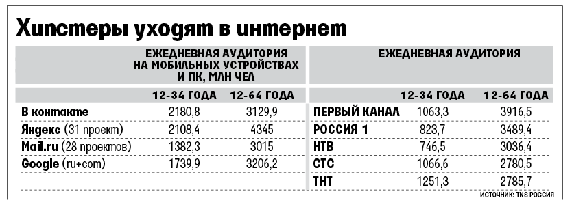 Социальная сеть «В контакте» превосходит все другие интернет-проекты, включая «Яндекс», и все федеральные телеканалы по популярности среди молодой аудитории (12-34 года) Москвы. Такой вывод позволяют сделать сентябрьские данные исследовательской компании «TNS Россия», которая сравнила количество уникальных пользователей российских интернет-ресурсов, посещающих их не реже раза в день с компьютеров и мобильных устройств, и аудиторию федеральных телеканалов в Москве. Из этих данных следует, что в течение сентября 2014 г. на страницы «В контакте» каждый день заходило 2,18 млн человек, на сайты «Яндекса» - 2,108 млн, Google - 1,73 млн, Mail.ru - 1,38 млн. Ежедневная аудитория пяти федеральных телеканалов распределялась так: 1,06 млн человек ежедневно смотрело «Первый канал», 1,06 млн - CTC, 1,25 млн - ТНТ, 0,82 млн - «Россию 1», 0,74 млн - НТВ.