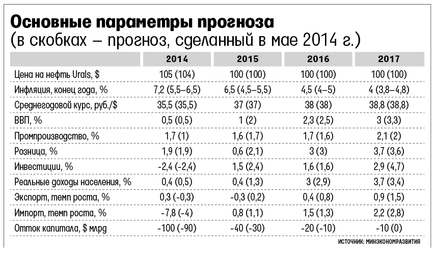 Минэкономразвития скорректировало прогноз на 2014 г. и следующие три года (см. таблицу), он станет основой проекта бюджета. Наиболее существенному изменению подверглись параметры 2014-2015 гг.: инфляция будет выше, сильнее, чем это виделось в мае, замедлится потребление, инвестиционный спрос останется слабым. Ухудшение прогноза связано с продолжением геополитической напряженности - прежний прогноз, сделанный в мае, исходил из быстрой деэскалации конфликта, пояснил директор департамента Минэкономразвития Олег Засов: «Мы надеялись, что уже со следующего года возобновятся существенные инвестиции, прежде всего частного сектора. Но мы видим сейчас, что ужесточились условия займов на внешних рынках, введены были дополнительные санкции, которые мы тоже не предполагали» (цитата по «Интерфаксу»).